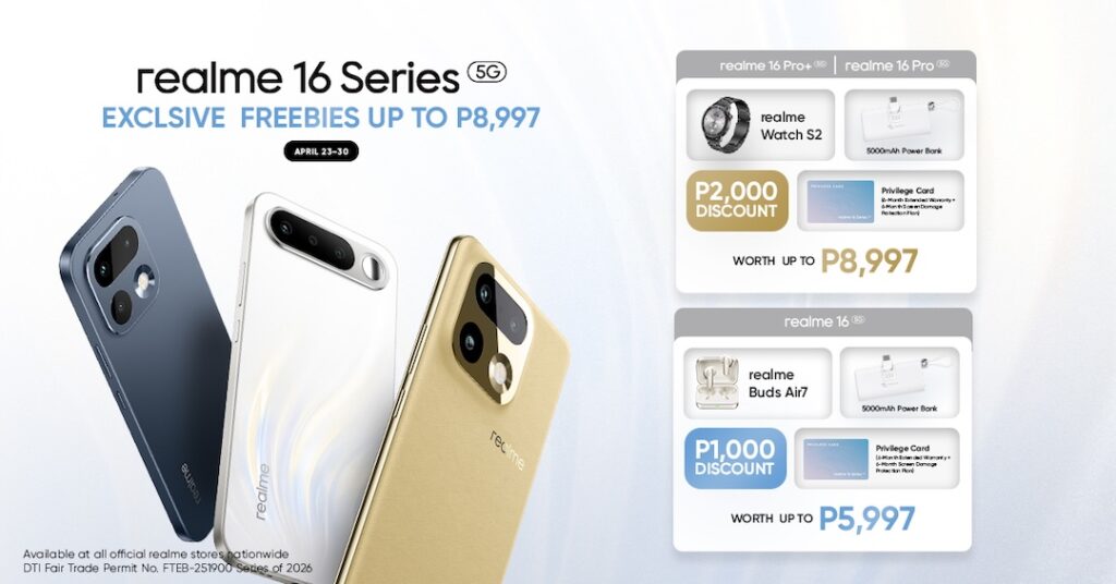 The Shopee Exclusive (April 23 – May 5): Grab the realme 16 5G for as low as ₱22,499! Plus, early buyers can get a free AKASO EK7000 action camera and up to ₱9,000 in total discounts.