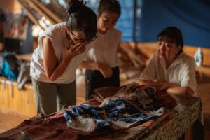 LEN CABILI (left) admires the details of woven art