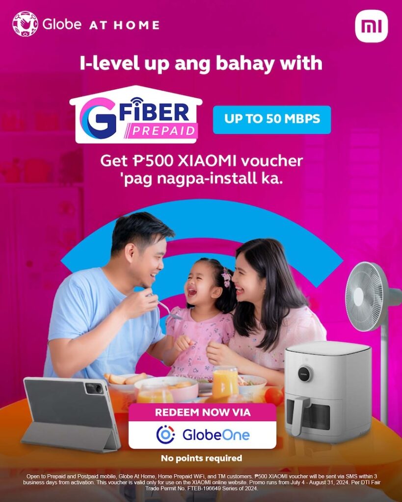 - New GFiber Prepaid subscribers get a P500 Xiaomi voucher just for signing up! This voucher unlocks access to Xiaomi’s wide range of innovative smart devices, allowing you to experience the convenience and fun of a connected home. Plus, GFiber Prepaid offers high-speed internet (up to 50 Mbps) for as low as P23 per day, perfect for seamless streaming and online activities. It’s reloadable with no monthly bills or contracts, and installation is a breeze – done within 24 hours!