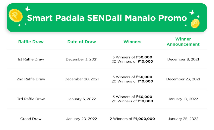 From November 15, 2021 to January 15, 2022, Smart Padala is not only bringing you more convenience for your SENDali transactions, but it is also rewarding you with exciting prizes amounting to a total of over P3,000,000!